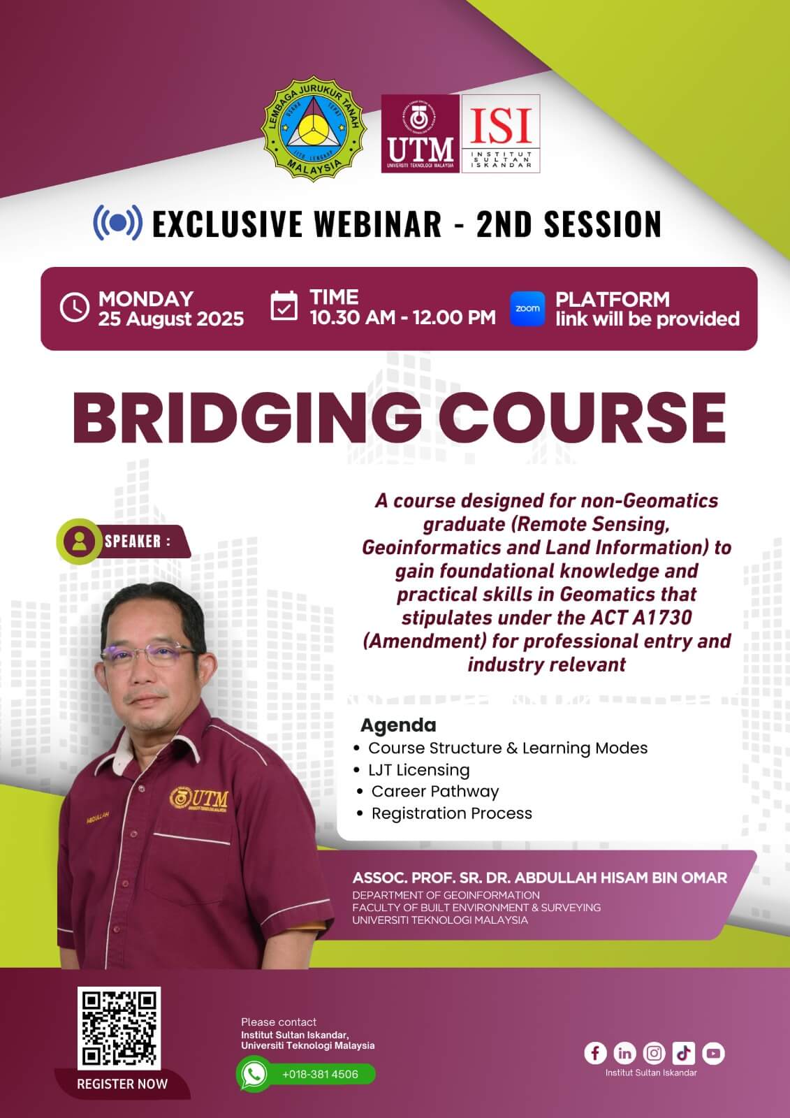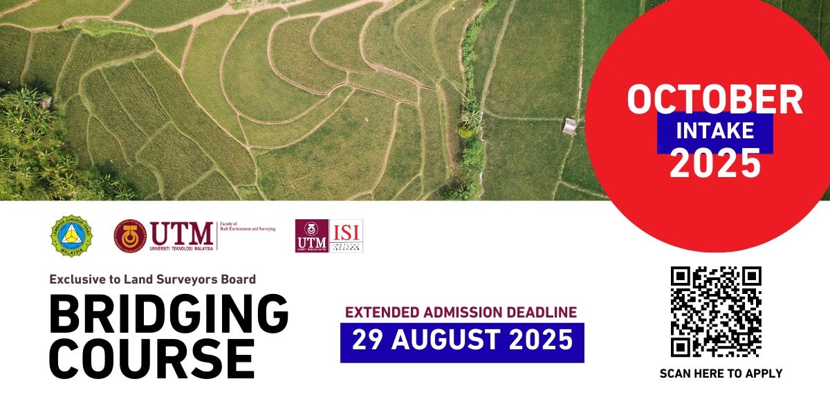 In collaboration with the Land Surveyors Board (LJT), the Faculty of Built Environment and Surveying (FABU), Universiti Teknologi Malaysia, and the Institut Sultan Iskandar (UTM-ISI), we proudly present an exclusive Bridging Course tailored just for you.