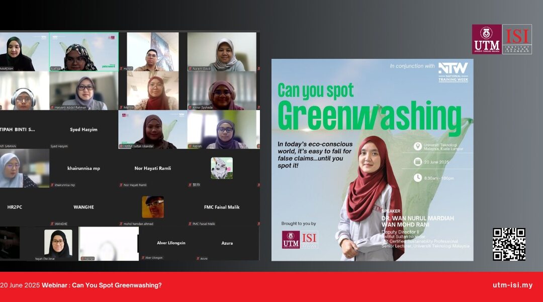 The webinar was presented by Dr. Wan Nurul Mardiah Wan Mohd Rani, Deputy Director II of ISI and Senior Lecturer at Universiti Teknologi Malaysia Kuala Lumpur, who is also a GRI Certified Sustainability Professional. The session involved the issue of greenwashing, which is the practice of making false or misleading claims related to sustainability in marketing and corporate communication strategies.